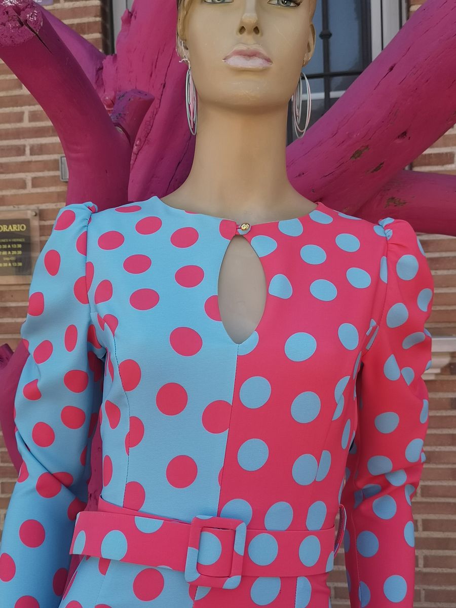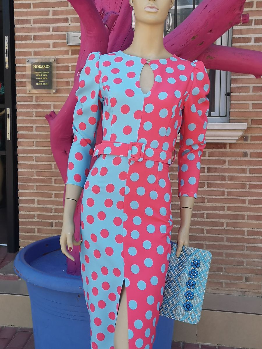 Vestido entallado bicolor lunares, con abertura delantera.